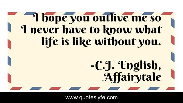 This page presents the quote "I hope you outlive me so I never have to know what life is like without you.". Author of this quote is C.J. English, Affairytale. This quote is about relationships, true-love, life, love, soulmates, romance-love-heartache, romance, marriage, love-story,.