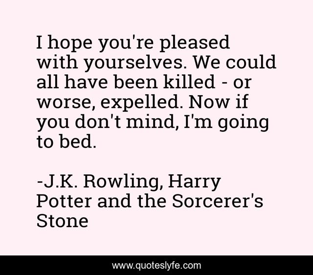 This page presents the quote "I hope you're pleased with yourselves. We could all have been killed - or worse, expelled. Now if you don't mind, I'm going to bed.". Author of this quote is J.K. Rowling, Harry Potter and the Sorcerer's Stone. This quote is about school, humor,.