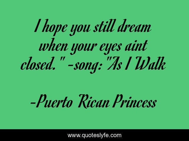 This page presents the quote "I hope you still dream when your eyes aint closed." -song:"As I Walk". Author of this quote is Puerto Rican Princess. This quote is about life-experience, belief, dreamergirl, dont-give-up, believing, inspirational, enthusiasm, life-and-living, life-lessons,.