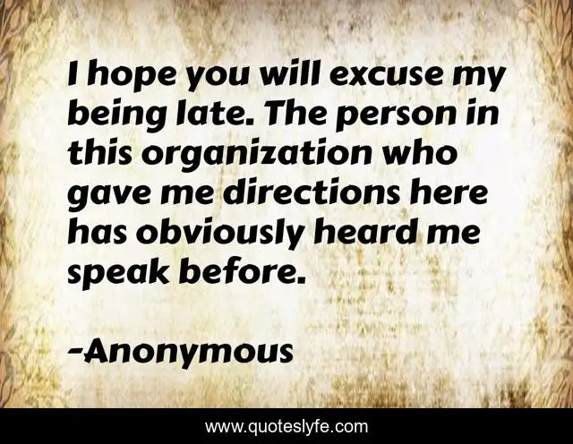 This page presents the quote "I hope you will excuse my being late. The person in this organization who gave me directions here has obviously heard me speak before.". Author of this quote is Anonymous. This quote is about introductions, openers,.
