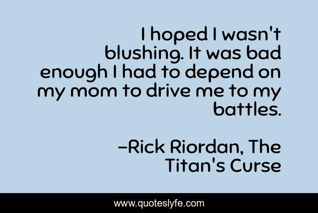This page presents the quote "I hoped I wasn't blushing. It was bad enough I had to depend on my mom to drive me to my battles.". Author of this quote is Rick Riordan, The Titan's Curse. This quote is about sally-jackson, percy-jackson,.