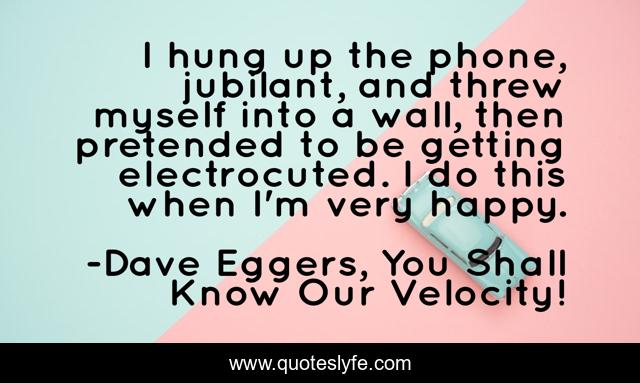 This page presents the quote "I hung up the phone, jubilant, and threw myself into a wall, then pretended to be getting electrocuted. I do this when I'm very happy.". Author of this quote is Dave Eggers, You Shall Know Our Velocity!. This quote is about funny, comedy,.
