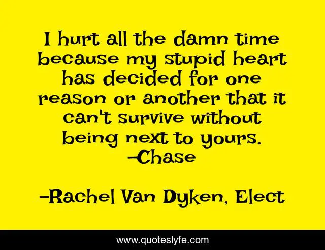 This page presents the quote "I hurt all the damn time because my stupid heart has decided for one reason or another that it can't survive without being next to yours. -Chase". Author of this quote is Rachel Van Dyken, Elect. This quote is about heart, survival, love, affection,.