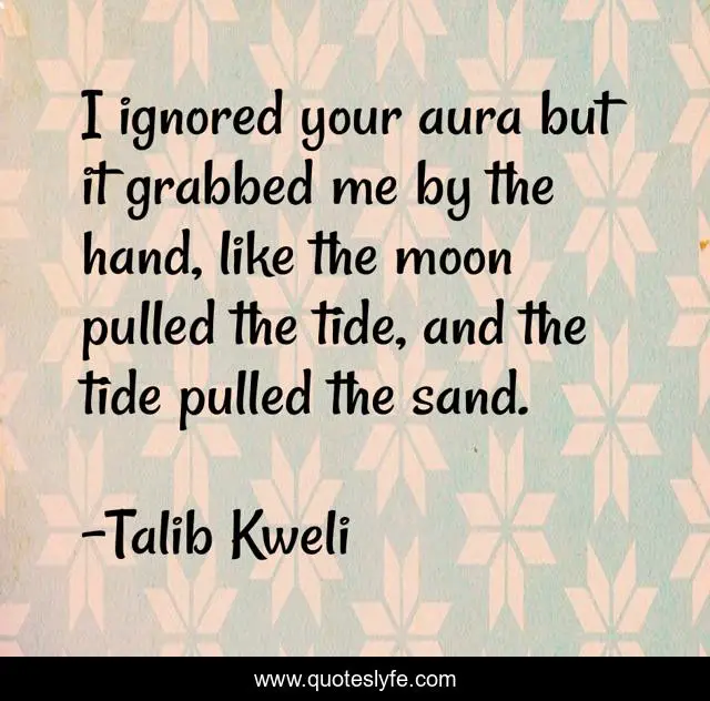This page presents the quote "I ignored your aura but it grabbed me by the hand, like the moon pulled the tide, and the tide pulled the sand.". Author of this quote is Talib Kweli. This quote is about sand, love, inspirational-love, affection, moon,.