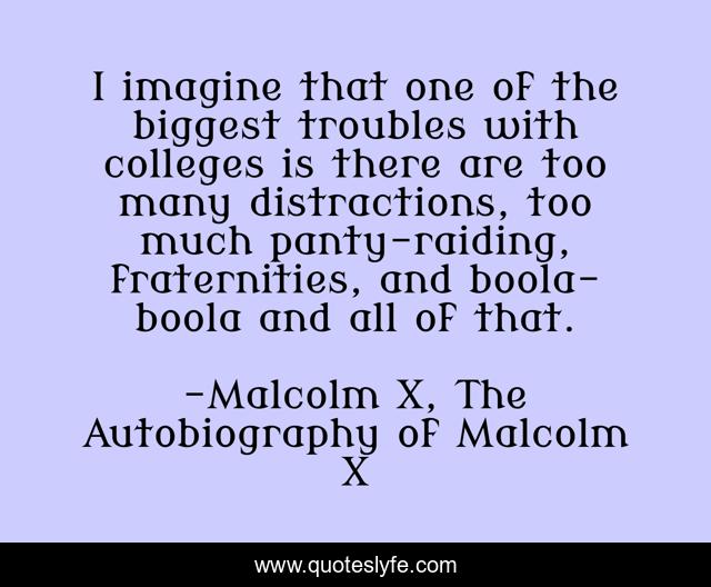 This page presents the quote "I imagine that one of the biggest troubles with colleges is there are too many distractions, too much panty-raiding, fraternities, and boola-boola and all of that.". Author of this quote is Malcolm X, The Autobiography of Malcolm X. This quote is about studying, education, college, schooling,.