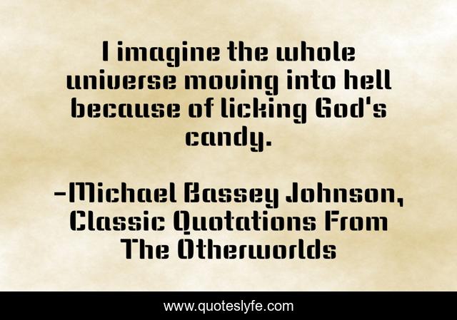 This page presents the quote "I imagine the whole universe moving into hell because of licking God's candy.". Author of this quote is Michael Bassey Johnson, Classic Quotations From The Otherworlds. This quote is about end-time, exaggeration, god, congregation, candy, go-to-hell, imagination, disbelieve, moving,.