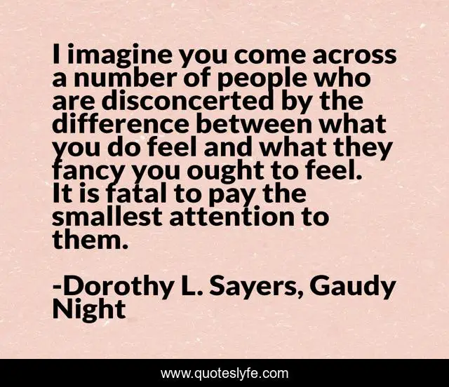 This page presents the quote "I imagine you come across a number of people who are disconcerted by the difference between what you do feel and what they fancy you ought to feel. It is fatal to pay the smallest attention to them.". Author of this quote is Dorothy L. Sayers, Gaudy Night. This quote is about feelings, sentiments, honesty, morality,.