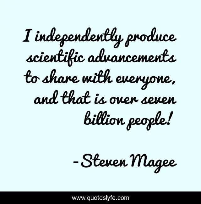 This page presents the quote "I independently produce scientific advancements to share with everyone, and that is over seven billion people!". Author of this quote is Steven Magee. This quote is about billion, advance, all, everyone, scientific, people, advancements, independant, share,.
