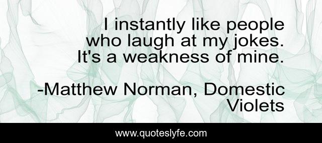 This page presents the quote "I instantly like people who laugh at my jokes. It's a weakness of mine.". Author of this quote is Matthew Norman, Domestic Violets. .