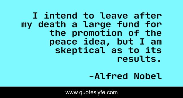 This page presents the quote "I intend to leave after my death a large fund for the promotion of the peace idea, but I am skeptical as to its results.". Author of this quote is Alfred Nobel. This quote is about peace, idea,.