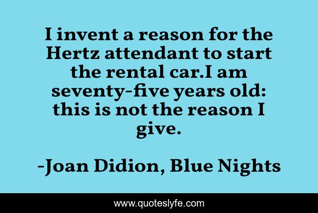 This page presents the quote "I invent a reason for the Hertz attendant to start the rental car.I am seventy-five years old: this is not the reason I give.". Author of this quote is Joan Didion, Blue Nights. .