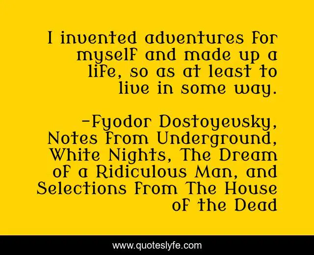 "Fyodor Dostoyevsky, Notes from Underground, White Nights, The Dream of a Ridiculous Man, and Selections from The House of the Dead Quotes." Quoteslyfe.com, 2025. Fri. 05 Dec. 2025. <https://www.quoteslyfe.com/quote/I-invented-adventures-for-myself-and-made-139359>.