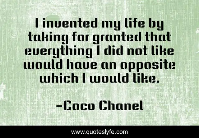 This page presents the quote "I invented my life by taking for granted that everything I did not like would have an opposite which I would like.". Author of this quote is Coco Chanel. This quote is about positive, confidence,.
