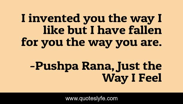 This page presents the quote "I invented you the way I like but I have fallen for you the way you are.". Author of this quote is Pushpa Rana, Just the Way I Feel. This quote is about love, feel, invention, passion, identity, way, invented, obsession, affection,.