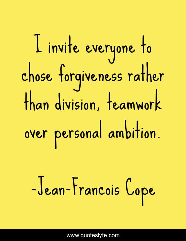 This page presents the quote "I invite everyone to chose forgiveness rather than division, teamwork over personal ambition.". Author of this quote is Jean-Francois Cope. This quote is about personal, teamwork, ambition,.
