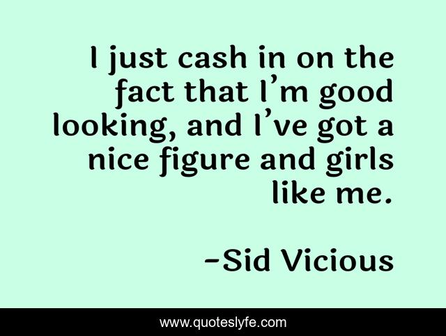 This page presents the quote "I just cash in on the fact that I’m good looking, and I’ve got a nice figure and girls like me.". Author of this quote is Sid Vicious. This quote is about good-looking, girls, cash,.
