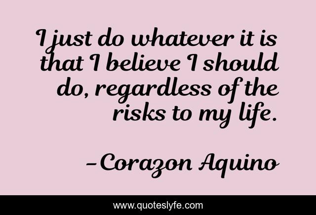 This page presents the quote "I just do whatever it is that I believe I should do, regardless of the risks to my life.". Author of this quote is Corazon Aquino. This quote is about life, believe, risks,.