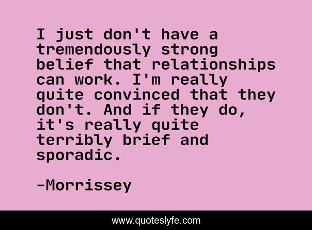 This page presents the quote "I just don't have a tremendously strong belief that relationships can work. I'm really quite convinced that they don't. And if they do, it's really quite terribly brief and sporadic.". Author of this quote is Morrissey. .