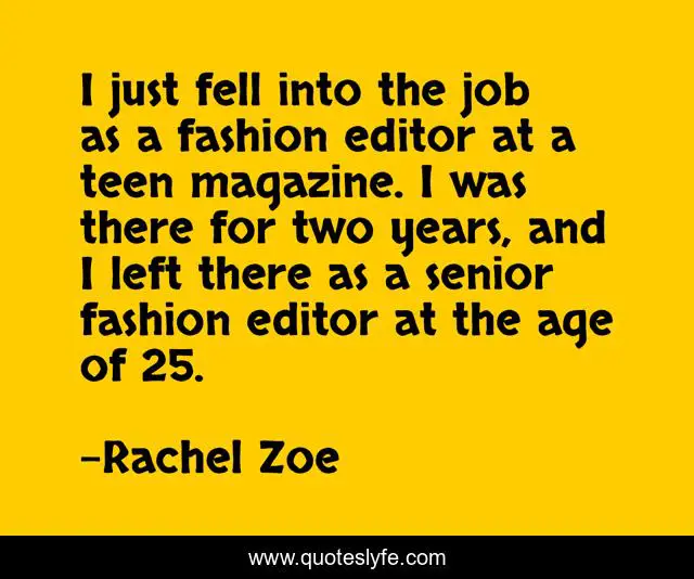 This page presents the quote "I just fell into the job as a fashion editor at a teen magazine. I was there for two years, and I left there as a senior fashion editor at the age of 25.". Author of this quote is Rachel Zoe. This quote is about age, fashion, job,.