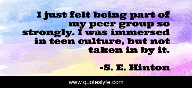 This page presents the quote "I just felt being part of my peer group so strongly. I was immersed in teen culture, but not taken in by it.". Author of this quote is S. E. Hinton. This quote is about being, culture, group,.