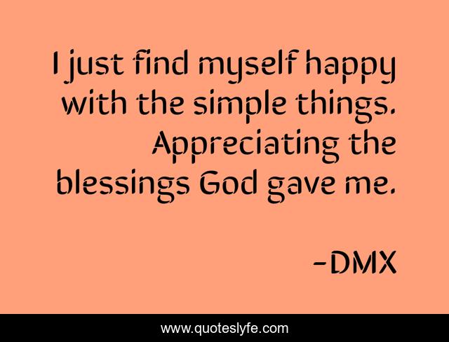This page presents the quote "I just find myself happy with the simple things. Appreciating the blessings God gave me.". Author of this quote is DMX. This quote is about simple, myself, happy,.