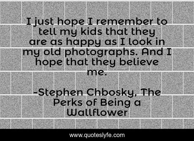 This page presents the quote "I just hope I remember to tell my kids that they are as happy as I look in my old photographs. And I hope that they believe me.". Author of this quote is Stephen Chbosky, The Perks of Being a Wallflower. This quote is about enthusiasm, inspirational,.