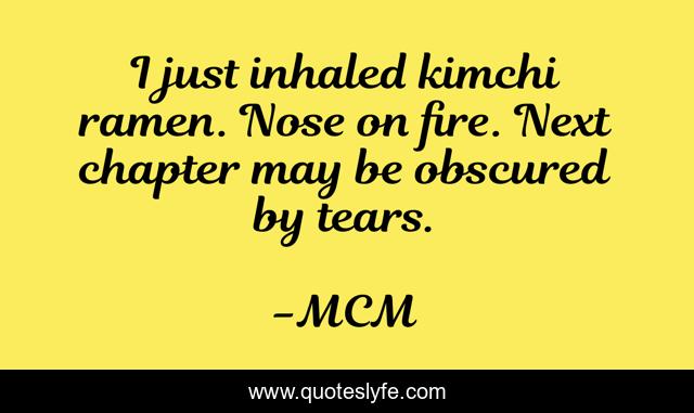 This page presents the quote "I just inhaled kimchi ramen. Nose on fire. Next chapter may be obscured by tears.". Author of this quote is MCM. This quote is about food, dangerous, writing-life, humor,.