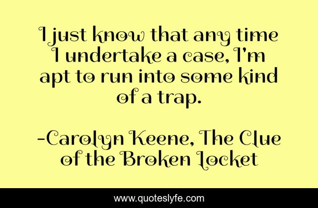 This page presents the quote "I just know that any time I undertake a case, I'm apt to run into some kind of a trap.". Author of this quote is Carolyn Keene, The Clue of the Broken Locket. .