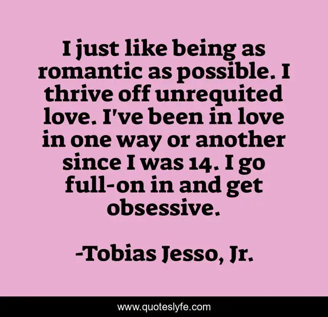 This page presents the quote "I just like being as romantic as possible. I thrive off unrequited love. I've been in love in one way or another since I was 14. I go full-on in and get obsessive.". Author of this quote is Tobias Jesso, Jr.. This quote is about way, love, possible, affection,.