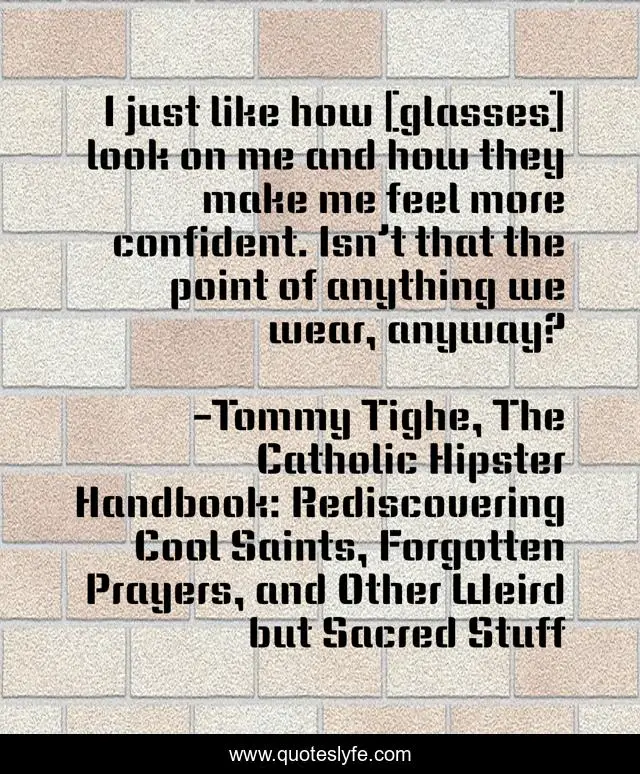 This page presents the quote "I just like how [glasses] look on me and how they make me feel more confident. Isn’t that the point of anything we wear, anyway?". Author of this quote is Tommy Tighe, The Catholic Hipster Handbook: Rediscovering Cool Saints, Forgotten Prayers, and Other Weird but Sacred Stuff. This quote is about confidence, accessories, sarah-vabulas,.