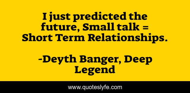 This page presents the quote "I just predicted the future, Small talk = Short Term Relationships.". Author of this quote is Deyth Banger, Deep Legend. This quote is about the, future, predicted,.