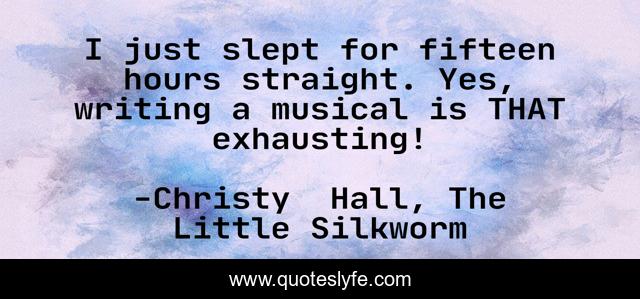 This page presents the quote "I just slept for fifteen hours straight. Yes, writing a musical is THAT exhausting!". Author of this quote is Christy Hall, The Little Silkworm. This quote is about writing, writers-on-writing, writers, writing-life, writing-process,.
