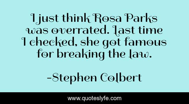 This page presents the quote "I just think Rosa Parks was overrated. Last time I checked, she got famous for breaking the law.". Author of this quote is Stephen Colbert. This quote is about law, think, time,.