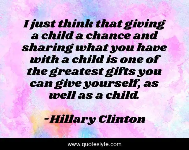 This page presents the quote "I just think that giving a child a chance and sharing what you have with a child is one of the greatest gifts you can give yourself, as well as a child.". Author of this quote is Hillary Clinton. This quote is about giving, child, yourself,.