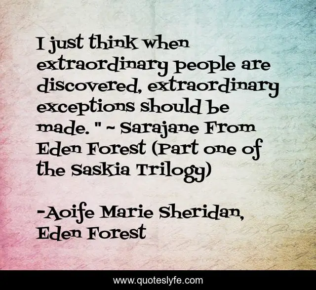 This page presents the quote "I just think when extraordinary people are discovered, extraordinary exceptions should be made. " ~ Sarajane From Eden Forest (Part one of the Saskia Trilogy)". Author of this quote is Aoife Marie Sheridan, Eden Forest. This quote is about magic, paranormal, romance, fantasy, saskia, young-adult,.