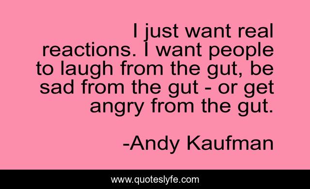 This page presents the quote "I just want real reactions. I want people to laugh from the gut, be sad from the gut - or get angry from the gut.". Author of this quote is Andy Kaufman. This quote is about laugh, people,.