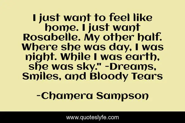 This page presents the quote "I just want to feel like home. I just want Rosabelle. My other half. Where she was day, I was night. While I was earth, she was sky." -Dreams, Smiles, and Bloody Tears". Author of this quote is Chamera Sampson. This quote is about alone, chamerasampson, pain,.