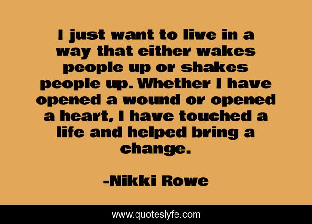 This page presents the quote "I just want to live in a way that either wakes people up or shakes people up. Whether I have opened a wound or opened a heart, I have touched a life and helped bring a change.". Author of this quote is Nikki Rowe. This quote is about real, life, painful-truth, lightworker, mindful, freedom, philosophy, free-spirit, spiritual,.