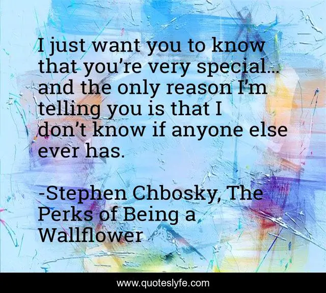 This page presents the quote "I just want you to know that you’re very special… and the only reason I’m telling you is that I don’t know if anyone else ever has.". Author of this quote is Stephen Chbosky, The Perks of Being a Wallflower. This quote is about stephen-chbosky, the-perks-of-being-a-wallflower, inspirational, enthusiasm,.