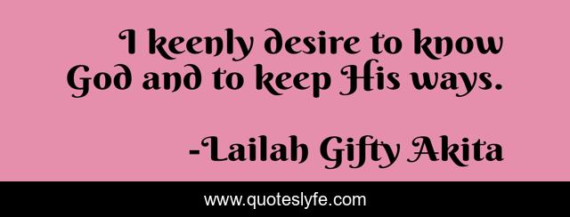 This page presents the quote "I keenly desire to know God and to keep His ways.". Author of this quote is Lailah Gifty Akita. This quote is about god, christian-life, seeking-god, spirituality,.