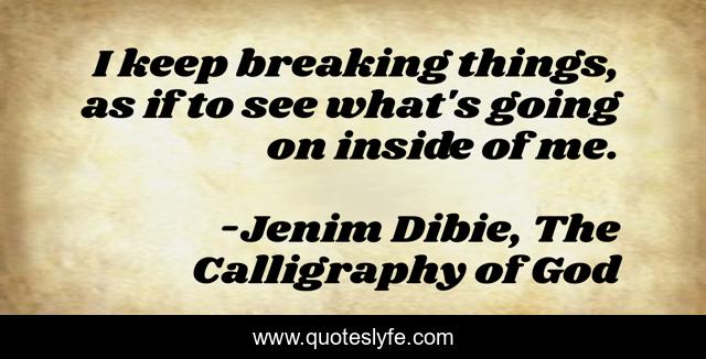 This page presents the quote "I keep breaking things, as if to see what's going on inside of me.". Author of this quote is Jenim Dibie, The Calligraphy of God. This quote is about love, beauty, jenim-dibie, god, poetry, sad, broken, sadness, passion,.
