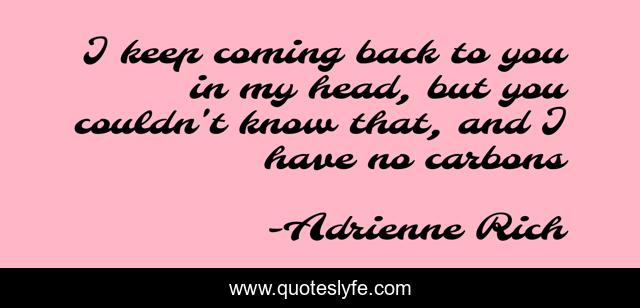 This page presents the quote "I keep coming back to you in my head, but you couldn't know that, and I have no carbons". Author of this quote is Adrienne Rich. This quote is about trust, miss,.