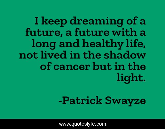 This page presents the quote "I keep dreaming of a future, a future with a long and healthy life, not lived in the shadow of cancer but in the light.". Author of this quote is Patrick Swayze. This quote is about light, life, future,.