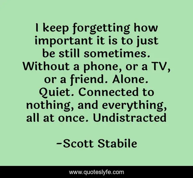 This page presents the quote "I keep forgetting how important it is to just be still sometimes. Without a phone, or a TV, or a friend. Alone. Quiet. Connected to nothing, and everything, all at once. Undistracted". Author of this quote is Scott Stabile. This quote is about alone, stillness, undistracted, life, quiet,.