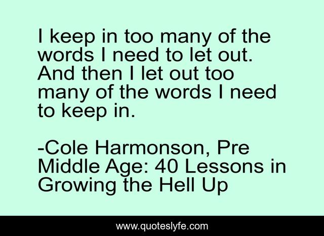 This page presents the quote "I keep in too many of the words I need to let out. And then I let out too many of the words I need to keep in.". Author of this quote is Cole Harmonson, Pre Middle Age: 40 Lessons in Growing the Hell Up. This quote is about release, thoughts, words, feelings,.