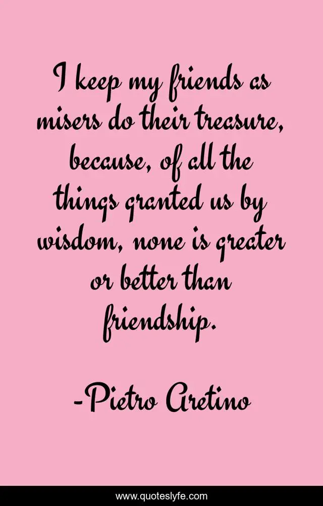 This page presents the quote "I keep my friends as misers do their treasure, because, of all the things granted us by wisdom, none is greater or better than friendship.". Author of this quote is Pietro Aretino. This quote is about better, friends, wisdom,.