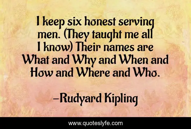 This page presents the quote "I keep six honest serving men. (They taught me all I know) Their names are What and Why and When and How and Where and Who.". Author of this quote is Rudyard Kipling. This quote is about writers, writing,.