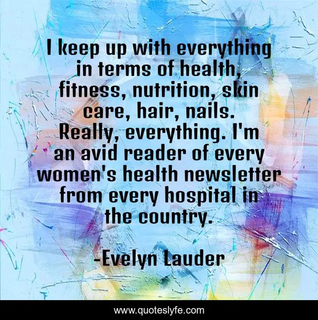 This page presents the quote "I keep up with everything in terms of health, fitness, nutrition, skin care, hair, nails. Really, everything. I'm an avid reader of every women's health newsletter from every hospital in the country.". Author of this quote is Evelyn Lauder. This quote is about hair, health, women,.
