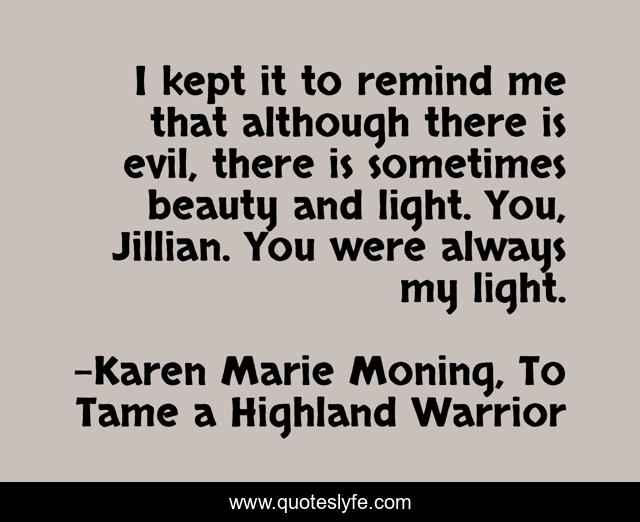This page presents the quote "I kept it to remind me that although there is evil, there is sometimes beauty and light. You, Jillian. You were always my light.". Author of this quote is Karen Marie Moning, To Tame a Highland Warrior. This quote is about longing, love, affection,.