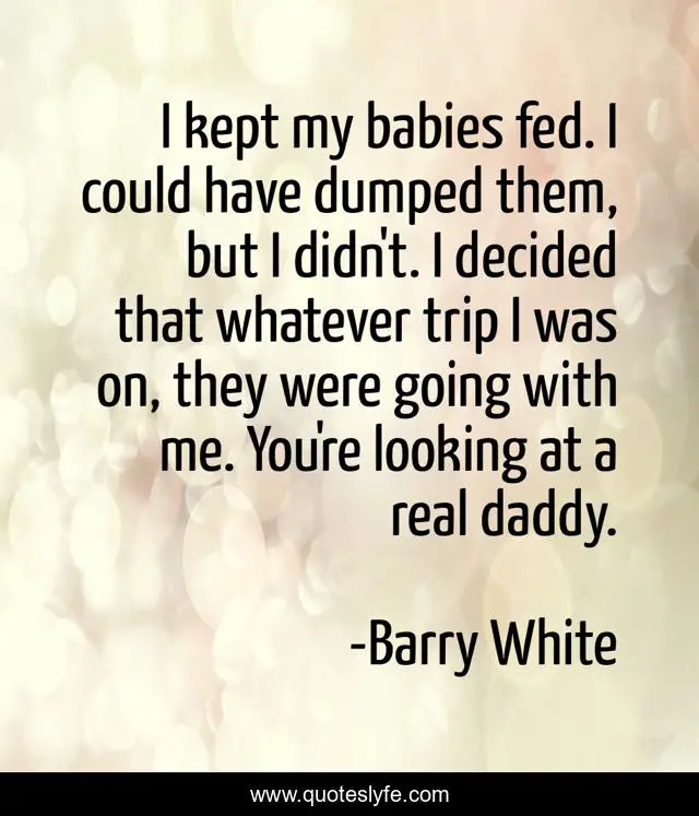 This page presents the quote "I kept my babies fed. I could have dumped them, but I didn't. I decided that whatever trip I was on, they were going with me. You're looking at a real daddy.". Author of this quote is Barry White. This quote is about me, looking,.